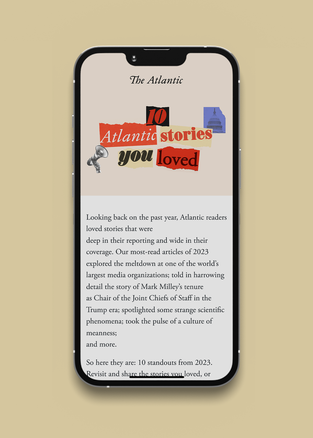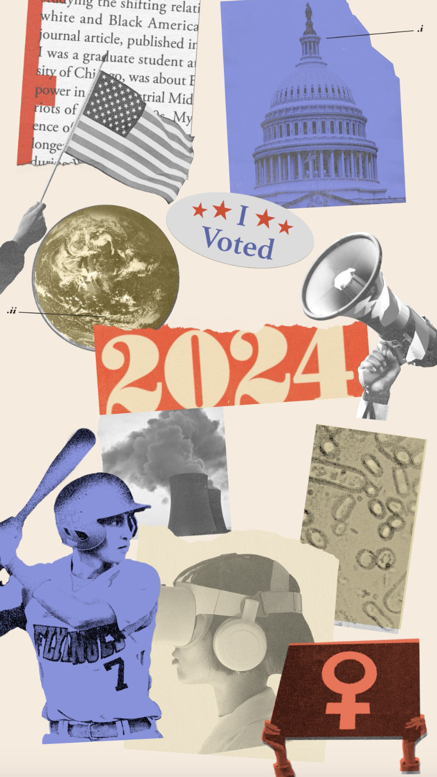 For The Atlantic Magazine's New Year's 2023 campaign, our graphic design project embodies the essence of "essential journalism for a consequential year" through dynamic collage paper cutouts. Utilizing a patriotic red, white, and blue color palette reminiscent of American elections, we intricately weave together diverse topics of news and culture into the visual narrative, each photo reflecting a pivotal aspect of the year ahead. From politics to pop culture, our design captures the magazine's commitment to delivering insightful perspectives on the most pressing issues shaping the year ahead.